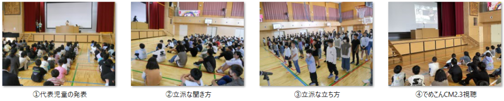 式後には高学年児童が作成した「でめこんCM」ver2・ver3のお披露目を行いました (写真④) 。「このCМは高学年のみなさんがみんなの健康な生活と、夢をかなえる力を付けるために作ったもの。全員で絶対に守って『でめたしでめたし』と言い合いましょう。」と話すと、「はいっ」と元気な返事が聞かれました。