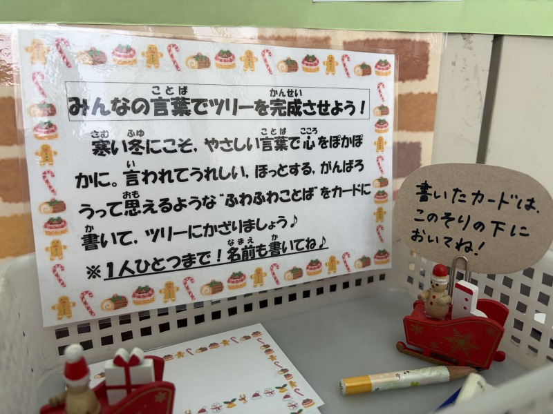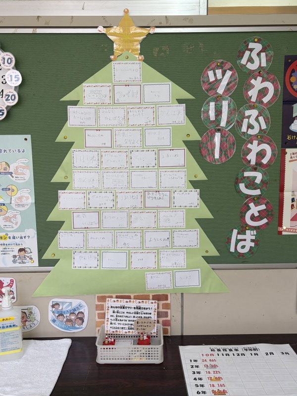 2025年12月23日 / 最終更新日時 : 2025年12月23日 mw2p8fe4j0 あかいっ子の様子 「ふわふわことば」クリスマスツリー もうすぐクリスマスです。保健室前には「ふわふわことば」クリスマスツリーが飾られています。「がんばって」「いいね」「ファイト」「がんばったね」などなど、温かい言葉でツリーが飾られています。 Post Views: 10