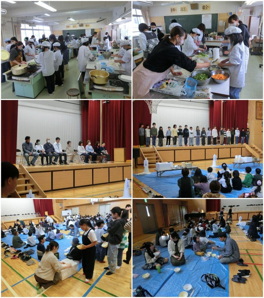 収穫祭が行われました。5年生が田植えをし、先日稲刈りや脱穀を行い、精米していただいたもち米はほかほかの「おふかし」となりました。それに加えて、地元の方々に提供していただいた味噌やねぎを活用し、5年生の児童と保護者が「豚汁」を作りました。ボランティアの皆様への感謝の場も設定され、その後は児童、ボランティア、PTA、5年生の保護者が講堂で一緒におふかしと豚汁を食べました。みんなで食べると楽しいのでしょうか、多くの人がおかわりをしていました。今回の収穫祭も、多くの皆様のご協力をいただき開催することができました。ありがとうございました。