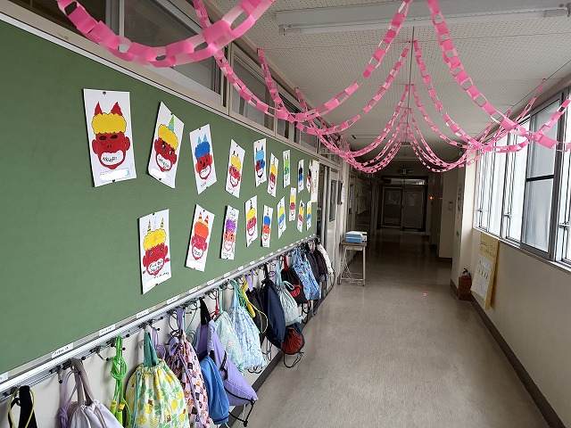 先週は「節分」でした。廊下には、1,2年生が描いた「こころのオニ」が掲示されていました。「ねぼうオニ」「ゲームおに」「しゅくだいすぐにしないオニ」などなど、自分のよくしていきたい点を「オニ」と見立てています。自分のことをしっかり見つめているなあと感心です。