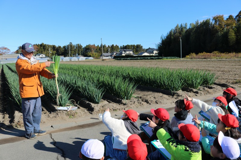 3年生が総合的な学習の時間で行っている「東松島うまいもの探検隊」の一環として、地域のねぎ農家さんの見学を行いました。本校の学校運営協議会の委員も務めていただいている山﨑さんの畑を訪問し、ねぎの育て方や、ねぎ農家の仕事についての話を聞いた後、ねぎの葉をむくという出荷作業の体験をしました。児童は普段慣れ親しんでいるねぎについて、新たな発見がたくさんあったと充実した表情を浮かべていました。