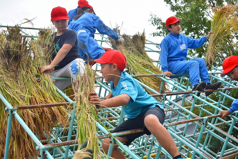 赤井小学校学校運営協議会「田んぼの学校」部会の皆様のご協力をいただき、春に植えた稲の稲刈りを行いました。鎌で稲を刈る大変さ、刈った後の処理など、貴重な体験ができました。縛られた稲は校庭のジャングルジムに干された後に、脱穀を行います。他の学校ではなかなか見ることのできない景色です。