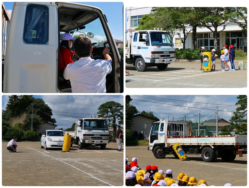 石巻中部自動車学校から3名の講師にご来校いただき、秋の交通安全教室を行いました。講師の方々から、ヘッドライトやウインカー、ブレーキランプなど、車で光るパーツの示す意味の確認や、車の速度に応じたブレーキの制動距離、大型車の内輪差による巻き込みの危険性について、実際に車を動かしていただき学ぶことができました。学区の中には、朝や夕方、非常に交通量が増える箇所もあります。自分の命を守ることができるよう、交通安全には本当に気を付けてほしいです。