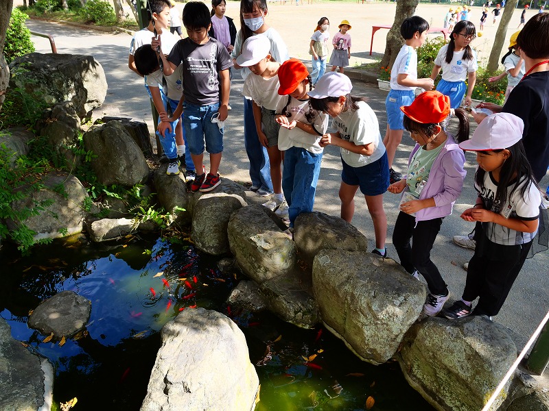 昼の放送で何回も告知が行われ、希望者多数で抽選も行われた環境委員会主催の一大イベント「金魚のエサやり体験」が昼休みに行われました。抽選を突破した子供たちが池の金魚にエサをやると、金魚が集まってきます。その姿を見ていた6年生は「日新館の鯉のようだ」とつぶやいていました。環境委員会の子供たちが日常的に行っていることも、このようににイベント化すると面白くなるものなのだと感心させられました。