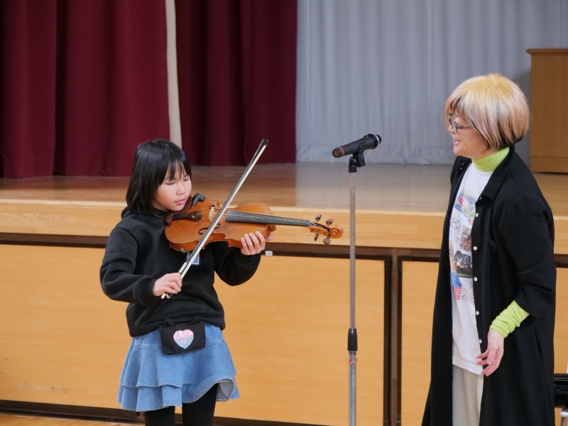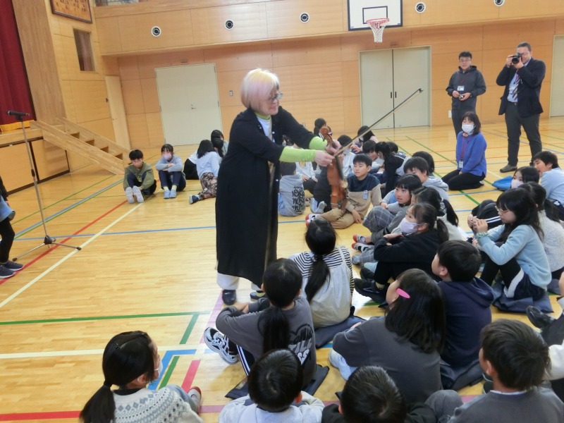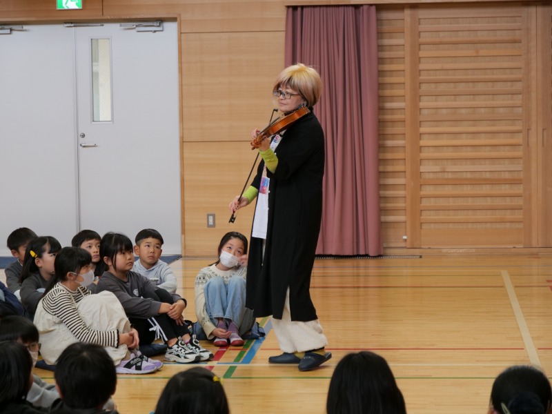 毎年恒例の、宮城県東松島市出身で、東松島市地域おこし協力隊、東松島市ふるさと大使のバイオリニスト、鹿嶋静さんの学校訪問が行われました。3,4年生が参加し、間近で話を聞いたり、バイオリンの演奏を聞くことができました。同じ曲でも、アレンジを変えると他の曲のように聞こえることや、バイオリン体験もしていただき、あっという間に時間が過ぎていきました。鹿嶋静さん、ありがとうございました。また来年お会いできることを楽しみにしています。