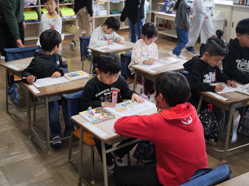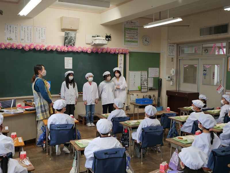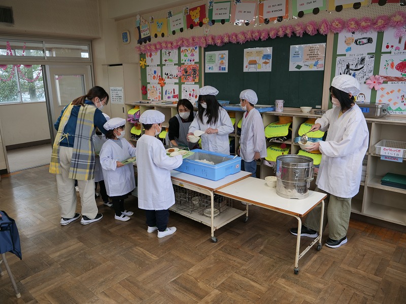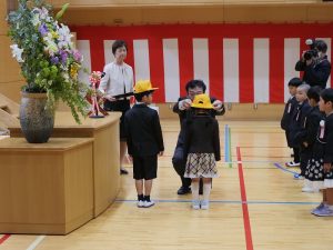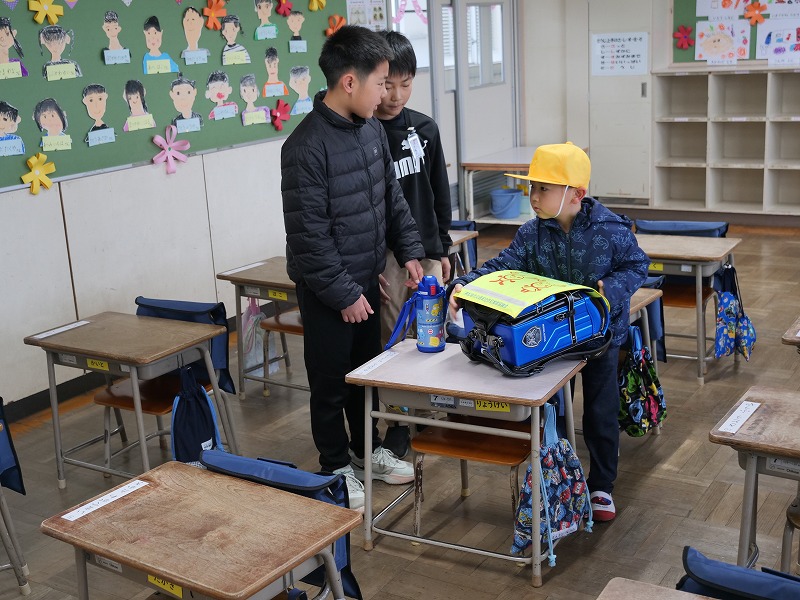 少し重そうに見えるランドセルを背負って、1年生が教室に「おはようございます」とちょっとドキドキしながら入ってきます、教室では6年生のお兄さん、お姉さんがランドセルから教科書を出すのを手伝ったり、連絡帳袋の出し方を教えたり、ロッカーへのしまい方を教えたりと大活躍です。初めて覚えることがたくさんありますが、少しずつでも覚えて、学校に慣れていってほしいです。さっそく給食もありました。6年生のお兄さんお姉さんに手伝ってもらいながら、準備や後片付けのやり方を覚え、初めての給食を食べた1年生でした。