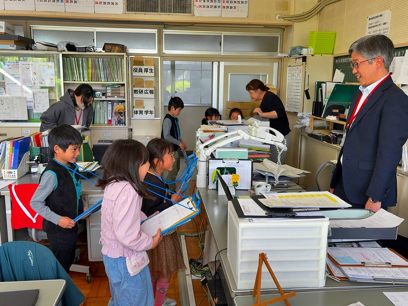 業間休みの時間、「しつれいします」とかわいらしい声で入ってきた1年生。生活科の「がっこうにいるひととなかよくなろう」の学習で、先生方への取材をしに来ました。「好きな色は何ですか?」「好きな食べ物は何ですか?」と、どきどきしながら質問していました。終わった後には、先生方のサインももらっていました。
