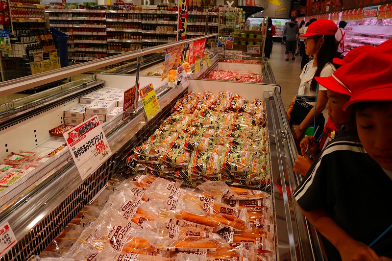 2グループに分かれてバックヤードと売り場を見学しました。売り場ではお客さんにインタビューを行い、バックヤードでは精肉、鮮魚、総菜、成果の加工や調理の様子を見学しました。普段買い物に来ているスーパーマーケットの裏側を知ることができ、充実した学びとなりました。